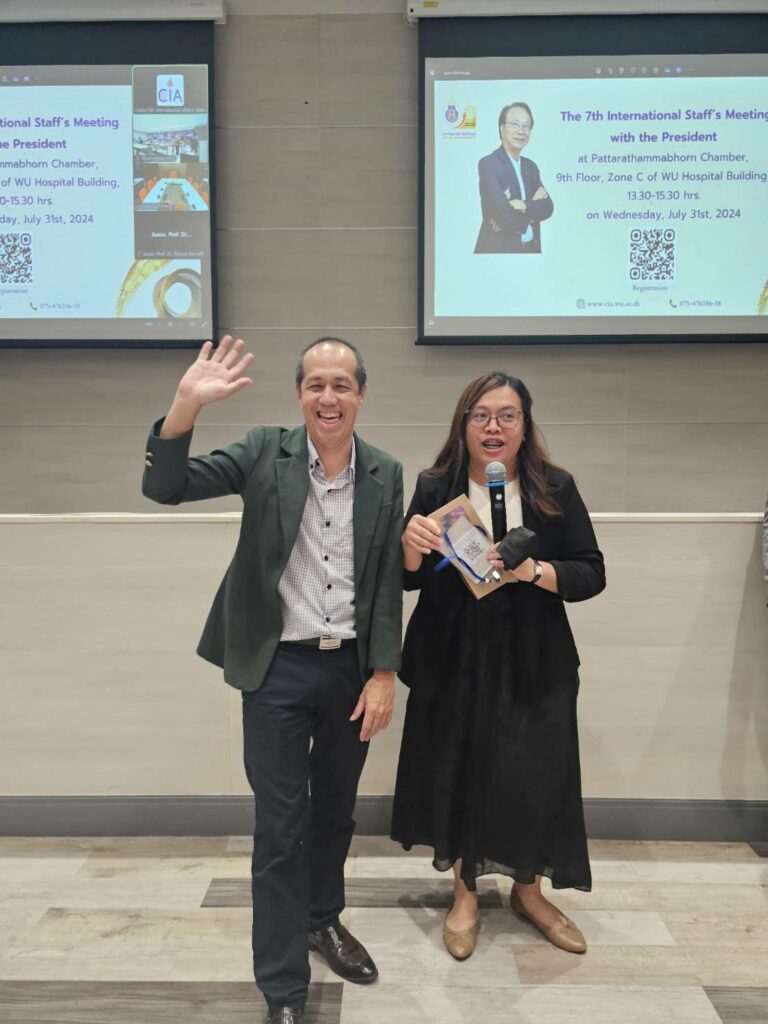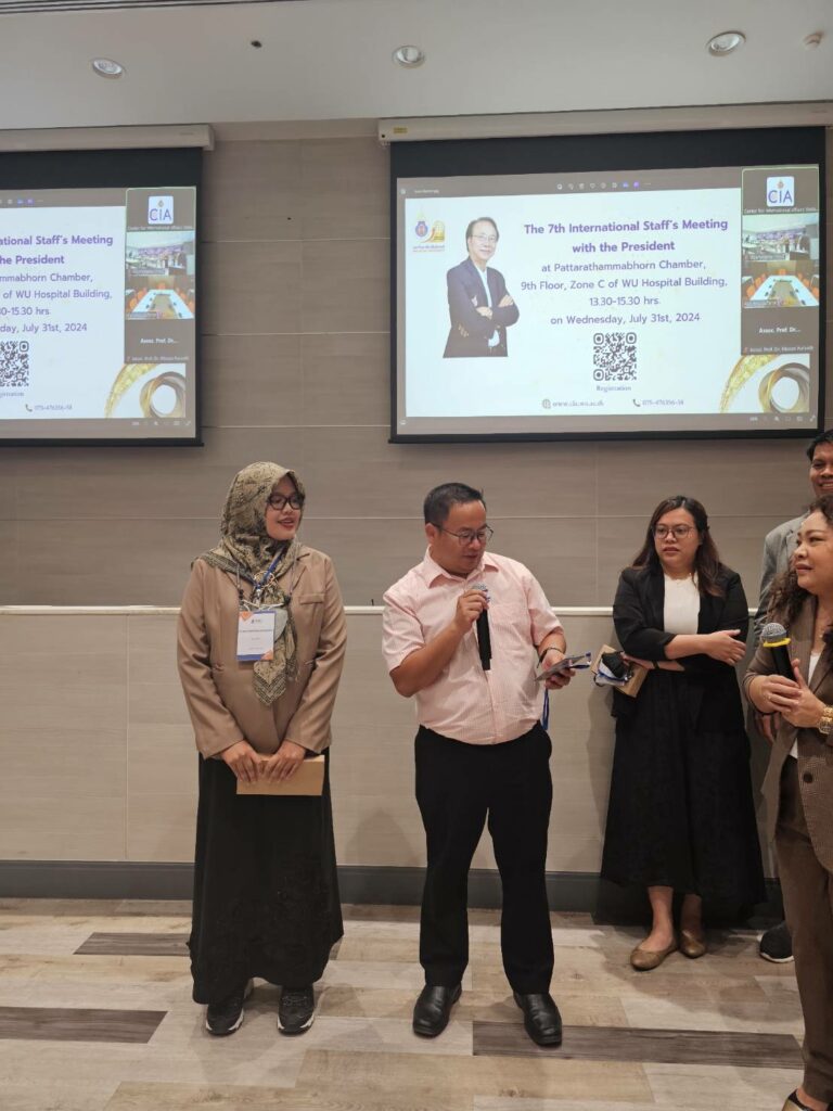 On July 31, the 7th President’s Meeting with International Staff was successfully held at the Phattaradharmaporn Meeting Room, WU Hospital. Over 60 international faculty members from 13 schools and colleges attended the event. In the President’s absence, Associate Professor Dr. Surin Maimsirikrod presided over the meeting.